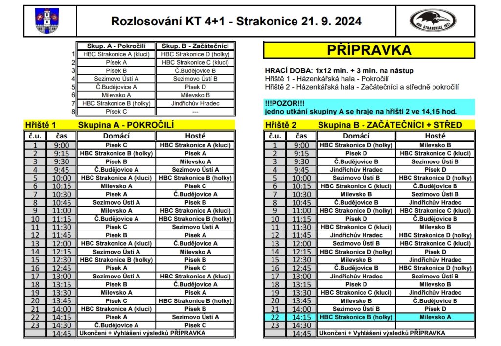 V obloukové hale ve Strakonicích se v sobotu 21. září uskuteční krajský turnaj přípravek v házené. Jeho začátek je naplánován na 9. hodinu, konec bude kolem 15. hodiny. Účastní se ho 15 týmů, které jsou rozdělené do dvou skupin – pokročilí a začátečníci. Čtyři družstva postavily domácí Strakonice a také Písek, po dvou mají České Budějovice, Milevsko a Sezimovo Ústí, jeden celek je z Jindřichova Hradce.