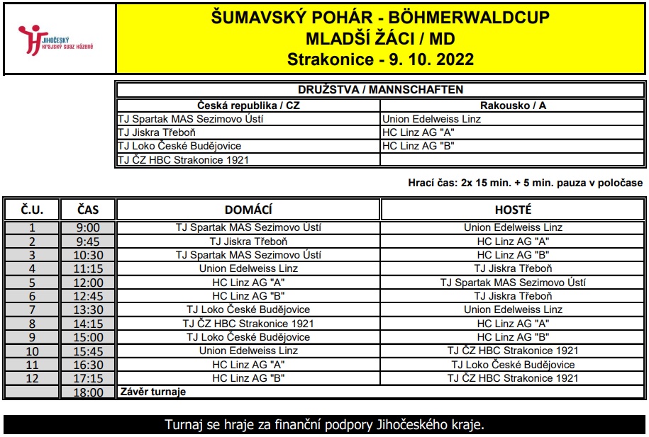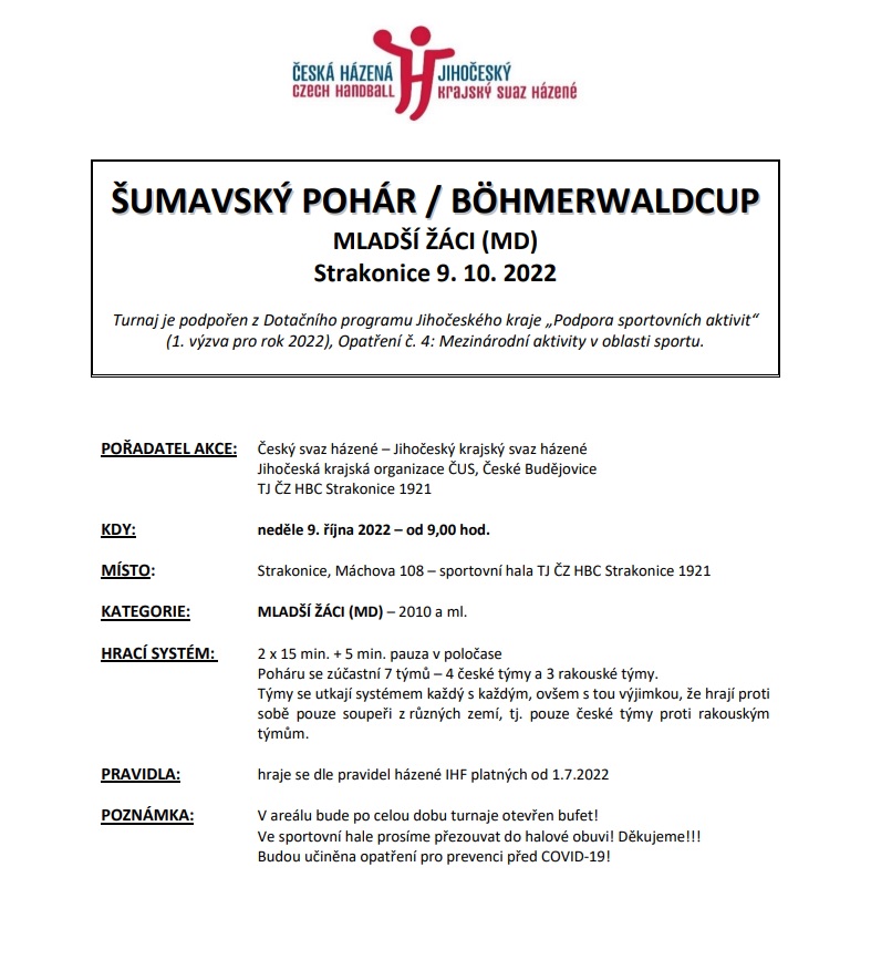 Turnaj „Šumavský pohár“ kategorie mladších žáků se koná v neděli 9. 10. 2022 ve Strakonicích, a to od 9,00 do cca 18,00 hod. Je zachován model, při němž proti sobě budou hrát zápasy pouze družstva z různých zemí – takže vždy české X rakouské družstvo. Na základě předběžné dohody s trenéry příslušné kategorie se navíc hraje dle speciálního „zrychleného“ rozlosování, kdy dopoledne budou hrát své zápasy 2 česká družstva (konkrétně Sezimovo Ústí a Třeboň) a odpoledne druhá 2 česká družstva (Č. Budějovice a Strakonice).