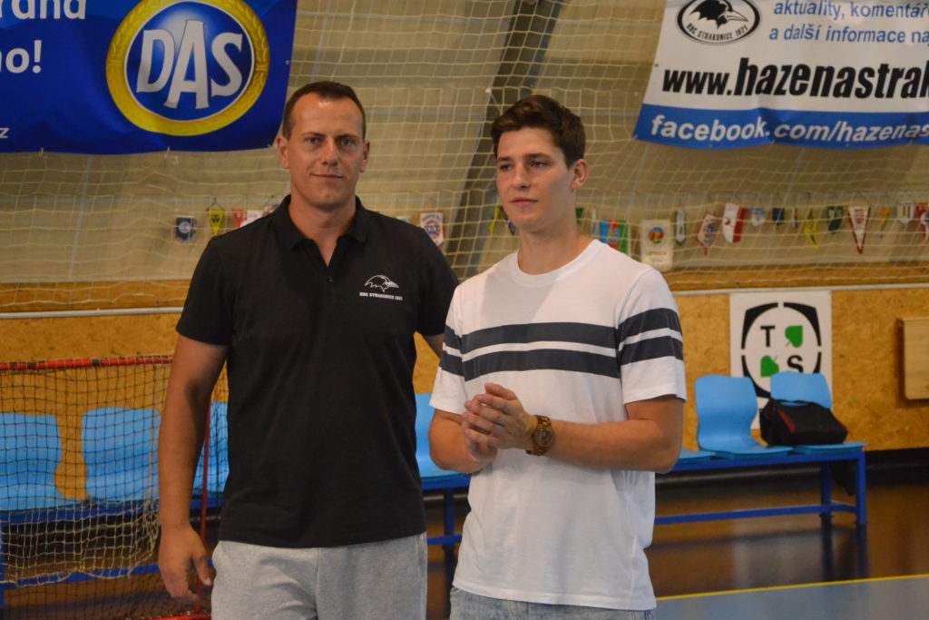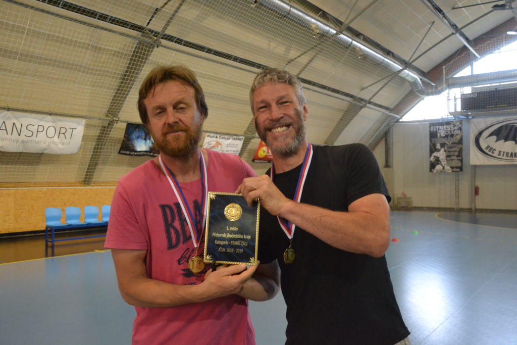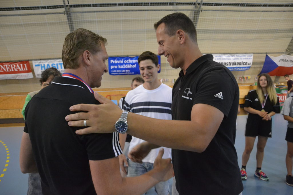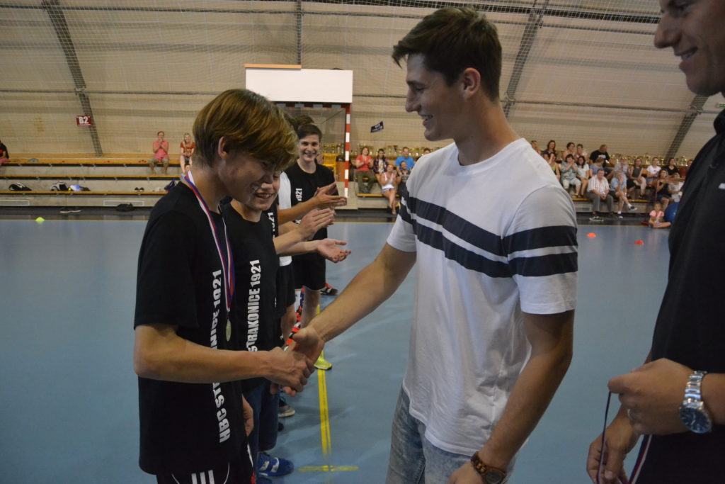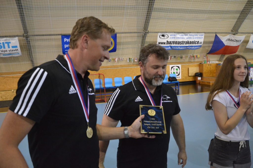 Kapitán strakonického týmu mužů Martin Mošovský a čerstvý vítěz extraligy v dresu Talentu Plzeň a strakonický odchovanec Tomáš Nejdl. Tito dva hráči byli těmi, kdo na závěr sezony v pátek 21. června v podvečer předali mladým házenkářům HBC 1921 medaile za prvenství v krajském přeboru. Stalo se tak v obloukové hale před zraky rodičů a příznivců strakonické házené.